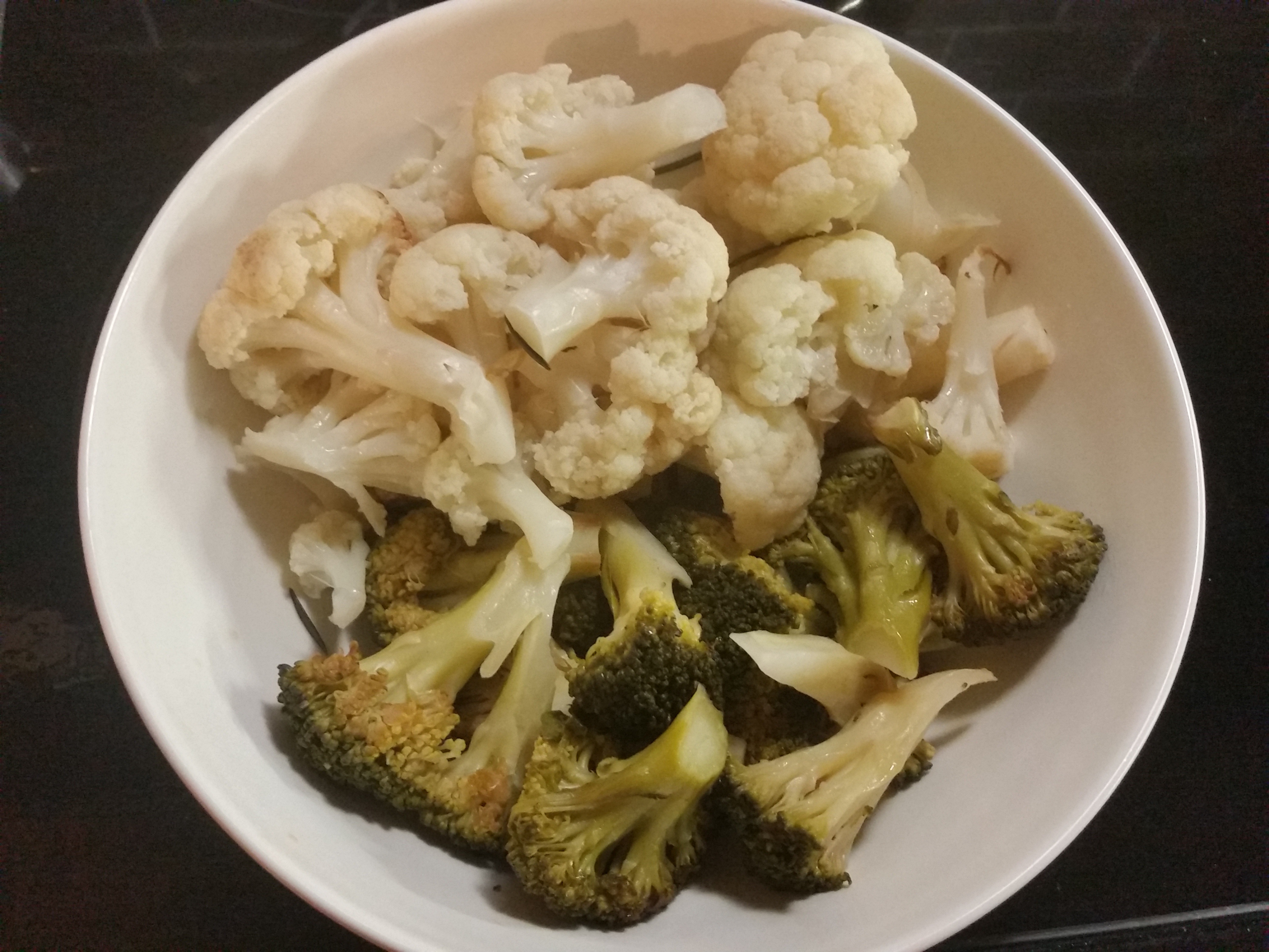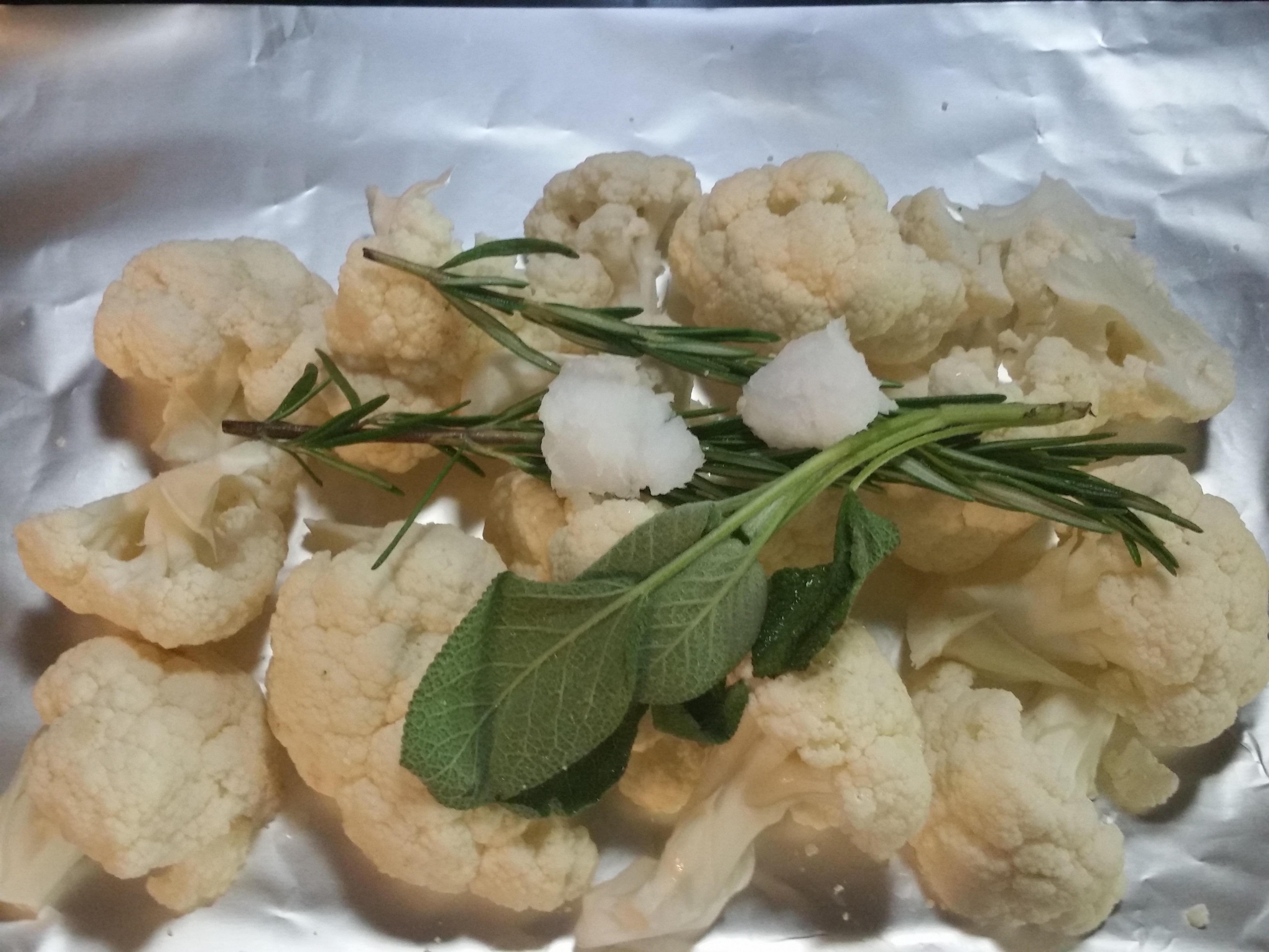 Step 13 - Roughly chop cauliflower and add fresh rosemary and sage before wrapping in foil. Put in oven 15 minutes before broccoli