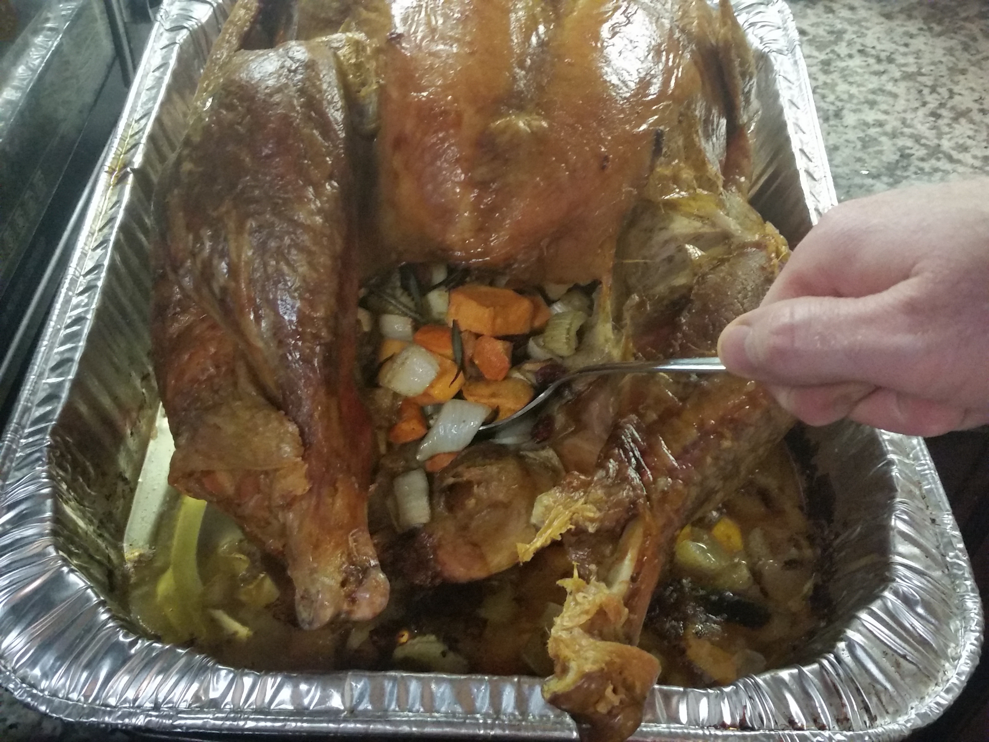 Since you are cooking from frozen and this turkey is going to be in the oven for quite a while it will be even more important than normal that you baste the turkey often. I like to pull the turkey out about once per hour and go to town with the turkey baster both on, as well as inside, the turkey. Just be sure to minimize the time you have the turkey out of the over so as to avoid disrupting the cooking process too much.